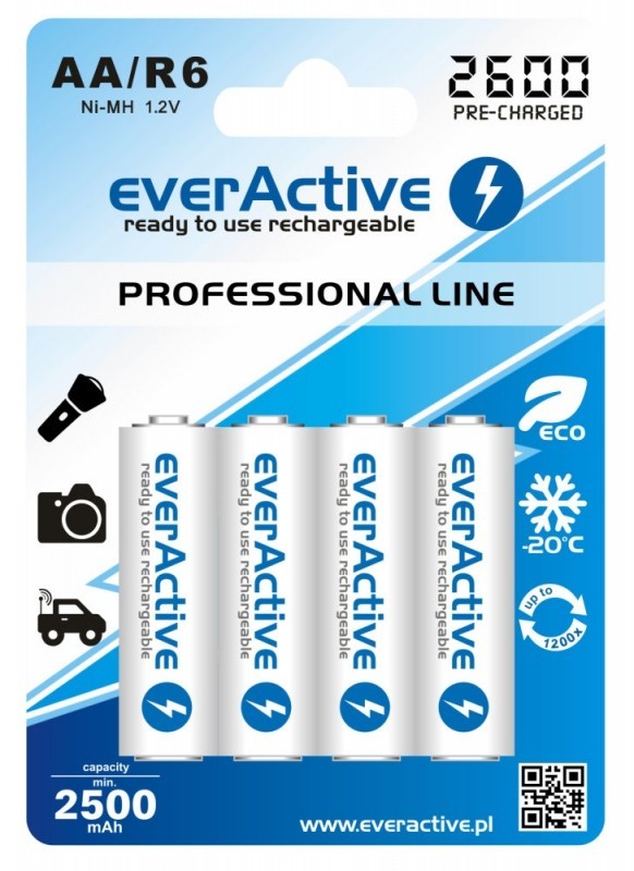 Nejmodernejší značková přednabitá nabíjecí baterie "Professional line" od společnosti everActive velikosti AA,R6, s nominání kapacitou 2500mAh, 4ks v balení blistr. Kapacita potvrzena testy v nezávislé laboratoři Intertek ve Švédsku dle normy IEC 61951-2 (7.3.2). Až 500 nabíjecích cyklů. Baterie si zachovají 80% energie i po 12 měsících od posledního nabití a skladování a jsou vhodné pro náročná zařízení jako svítilny, hračky, přenosná zařízení a pod. Baterie everActive vám nabízí značkovou kvalitu za skvělou cenu. Vhodné pro náročná zařízení s odběrem až 2A (2.0C)