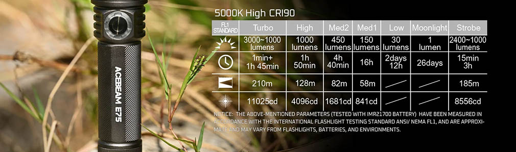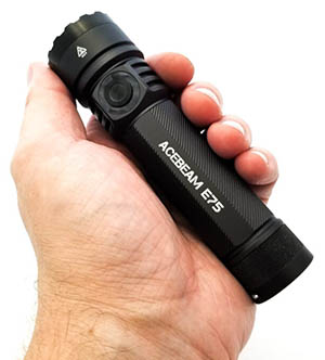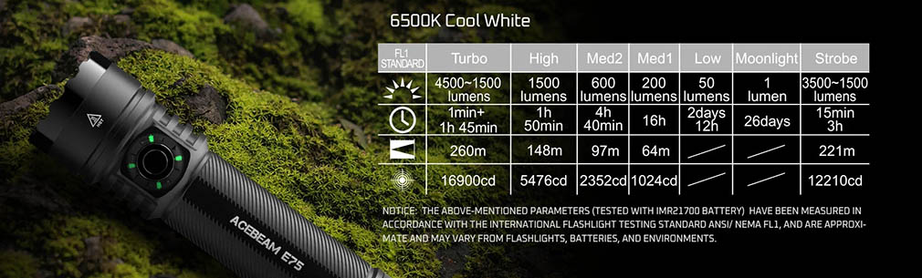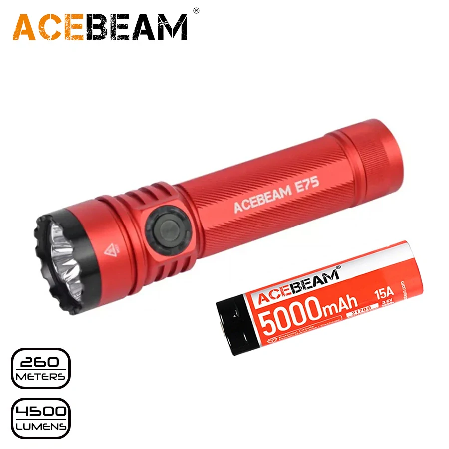 Acebeam E75 je vysoce výkonná svítilna se světelným tokem až 4500 lumenů a dosvitem 260 metrů. Tyto parametry zaručují široký a plný kužel. E75 se dodává ve dvou variantách, s Quad-CORE LED čipy CW 6500K (4500 lumen) nebo NW 5000k Nichia 519A s vysokým CRI90 (3000 lumen). K napájení používá jeden vysokoproudový lithium-iontový akumulátor 21700 (součástí balení). Dobíjení přes USB-C konektor umístěný pod vodotěsnou krytkou na těle svítilny. Vzhledem ke kapesním rozměrům je baterka vhodná pro každodenní použití a nošení v kapse (EDC). Je vhodná pro univerzální použití a všechny aktivity, kde potřebujete obrovský výkon a dlouhou výdrž svícení.