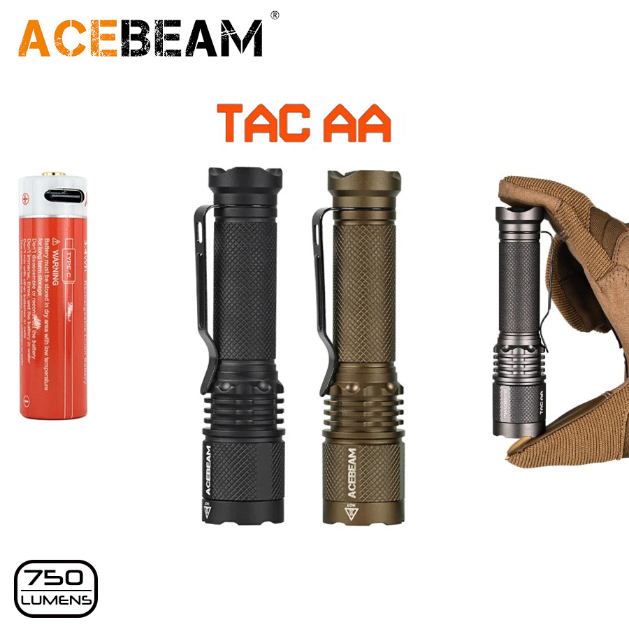 Kapesní EDC svítilna TAC AA disponuje světelným výkonem až 750 lumen generovaných čipem Nichia 519A-V1 s teplejším odstínem světla 5000K a High CRI90. Hybridní napájení umožňuje použít jak klasickou tužkovou baterii tužkovou baterií AA nebo nabíjecí AA NiMH, nebo Li-Ion 14500 - ta je součástí balení, jedná se o výkonný Li-Ion akumulátor 14500 s vlastním USB-C konektorem pro dobíjení, se kterým je možné dosáhnout maximálního světelného výkonu. Dodává se v barevných variantách těla - černá a Coyote (měď) - vyberte z výběrové lišty vedle hlavního obrázku.