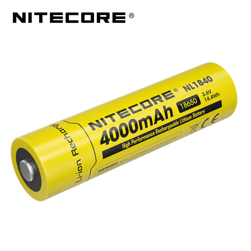 Značkový dobíjecí akumulátor Li-ion 18650 Nitecore 3.6V 4000mAh Protected (s ochranným okruhem) model NL1840 s vybíjecím proudem 5A. Nabíjet lze v klasické nabíječce (Nitecore UMS2 / UMS4 / Ci2 / Ci4 / Xtar a další).