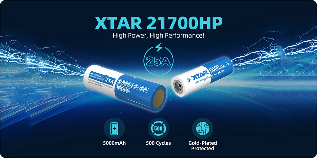 XTAR 21700HP 5000 mAh je výkonný chráněný Li-ion akumulátor typu 21700 navržený pro zařízení s vysokým odběrem proudu, kde je klíčová kombinace vysoké kapacity a stabilního výkonu. Tento model využívá moderní chemii Li-ion článků s důrazem na bezpečnost a dlouhou životnost, přičemž nabízí kapacitu 5000 mAh a kontinuální vybíjecí proud až 25 A.