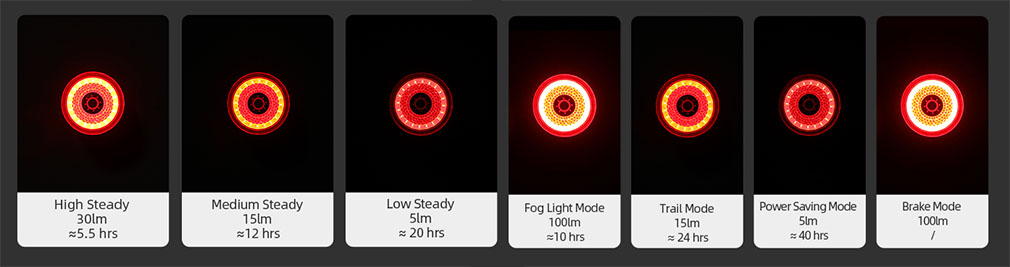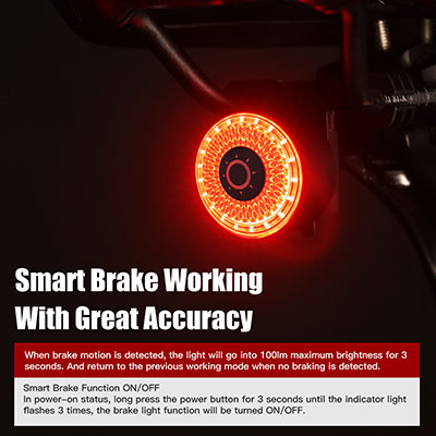 SMART BREAKING: brzdová funkce je aktivována pomocí Gyroskopu s akcelerometrem (6-Axis) zabudovaného ve světle. Pokročilý senzor spolu s procesorem neustále vyhodnocuje jízdu a jakmile detekuje brzdný manévr, přepne na 3s do režimu agresivního svícení s nejvyšším výkonem 100 lumen.