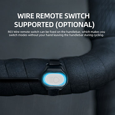 kabelové ovládání R03 (je obsahem balení) - svítilnu lze ovládat jak tlačítkem na svítilně, tak i dálkovým ovládáním, které se upevní suchým zipem blízko gripu řídítek; cyklista tak neztrácí kontrolu nad řízením při přepínání režimů.
