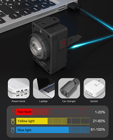 Světlo má vestavěný akumulátor Li-Ion o kapacitě 3000mAh. Dobíjení akumulátoru přes pracho-vodotěsný USB-C konektor umístěným na zadní straně svítilny. Nabíjecí port podporuje rychlodobíjení a zcela vybitou svítilnu tak plně nabijete už za přibližně 2hod. Svítilnu lze velmi jednoduše nabíjet z USB 5V zdroje (nabíječka na mobil, PC, USB adaptér do sítě, USB Autoadaptér, powerbanka atd). Tip: Svítilna může být zapnutá (v Low režimu) i během dobíjení! To znamená pokud Mars dobíjíte přímo na kole z powerbanky, nezůstanete bez světla. Indikace stavu baterie: Nízkou kapacitu baterie elektronika oznámí změnou barvy LED podsvícení hlavního tlačítka (viz obrázek).