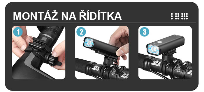 Montáž na řídítka se provádí nacvaknutím do přiloženého držáku, který může být na řídítkách umístěn trvale (lze také zakoupit náhradní držák, pokud máte více kol a chcete ušetřit čas přehazováním držáku). Vyjmutí nebo vložení svítilny je tak otázkou okamžiku. Úchyt má možnost nastavení na různé průměry řídítek (20-40mm). Držák je horizontálně otočný a světlo je tak možné nastavit krokově po 90°. Držák je stabilní a svítilna drží spolehlivě i při průjezdu těžkým terénem. Vzhledem k nízké hmotnosti a malým rozměrům je svítilna ideální také pro montáž na přilbu, pomocí držáku na přilbu. Doporučujeme také montáž do podvěsu na předsazený držák: pomocí držáku H09 nebo Gaciron H10C. Nebo na Vás stávající držák, který má spodní GoPro bajonet pomocí H07L GoPro adaptéru.