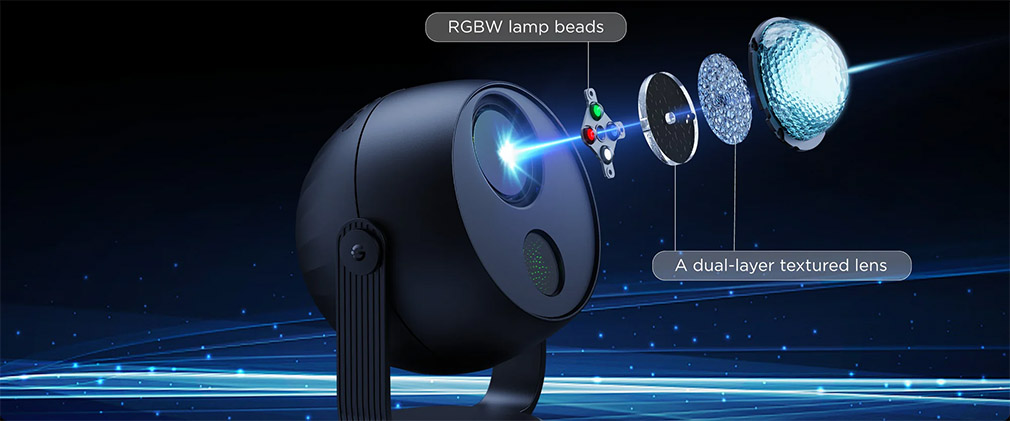 Projektor využívá pokročilou světelnou technologii s podporou 16 milionů barev, které můžete libovolně kombinovat a přecházet mezi nimi plynule nebo dynamicky. Díky více než 40 přednastaveným světelným scénám si snadno najdete styl projekce odpovídající vaší náladě, od uklidňujících pastelových tónů po výrazné barevné efekty.