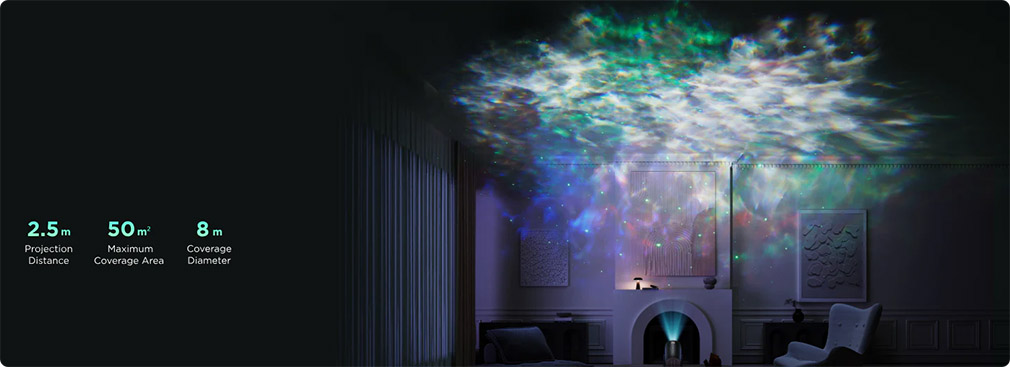 Tento projektor nabízí více než 50 přednastavených scén světelných efektů, které můžete okamžitě měnit podle nálady nebo atmosféry vašeho prostoru. Barvy a pohyb mlhovin lze upravovat i v režimu DIY, takže si můžete vytvořit vlastní unikátní světelnou show. Projektor má i režim chytrého spánku a časovač, který umožňuje automatické ztlumení nebo vypnutí světel s ohledem na rytmus vašeho dne.