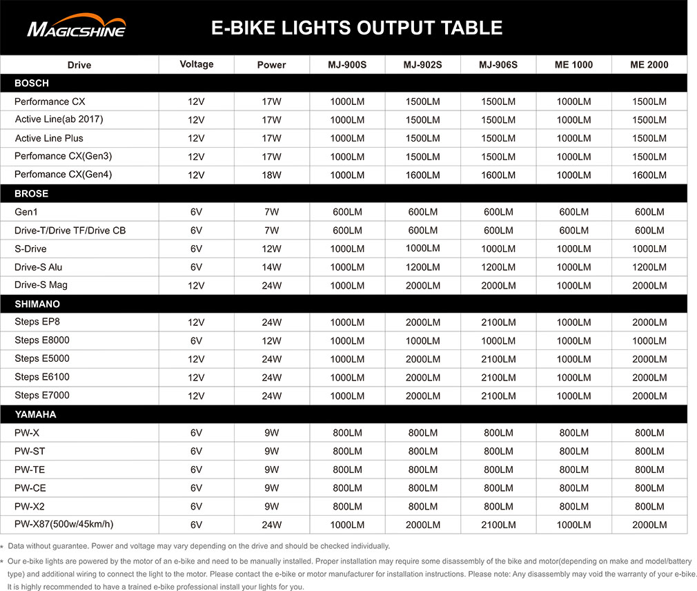 Výkon svítilny se automaticky přizpůsobí vstupnímu napětí 6-12V. Senzor okolního světla aktivní v režimu elektrokola.