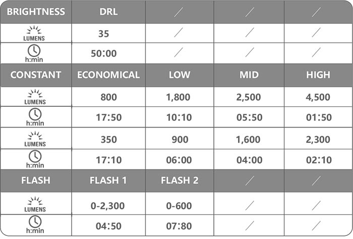 Svítilna disponuje 4 intenzitami světla pro samostatnou levou nabo pravou led a dalšími 4 intenzitami světla při zapnutí obou led současně. Dále 1 intenzitou pro DRL denní svícení a v nabídce je i režim klasické blikačky ve 2 intenzitách, který je umístěn mimo menu a dostupný přes dvojklik tlačítka. Lze tak světlo přesně dávkovat a z množství režimů si vybere každý. Svítilna má paměť na poslední zapnutý režim a tak máte svůj oblíbený režim vždy ihned k dispozici. Časy výdrže svícení (v hodinách) jsou pro jednotlivé režimy uvedeny na obrázku.