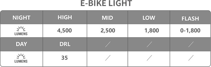Výkon světla se odvíjí od výkonu motoru nebo baterie. Základní výkony svícení jsou uvedeny v tabulce. Při použití svítilny na elektrokole a připojení na motor, svítilna disponuje 3 intenzitami světla, 1 intenzitou blikačky a dále 1 intenzitou pro DRL denní svícení. SMART funkce: ve svítilně integrován senzor intenzity denního světla, který vyhodnocuje okolní světelné podmínky a automaticky aktivuje hlavní reflektor. Přes den při dostatečných světelných podmínkách je aktivní jen DRL reflektor s intenzitou 35 lumen.