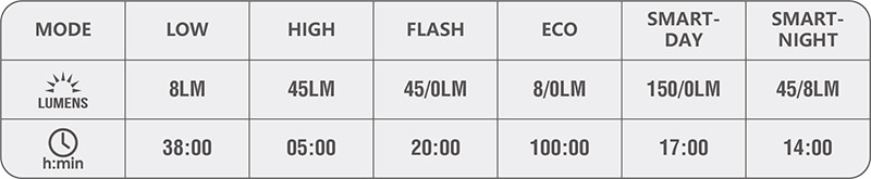 - 2 režimy svícení / 1 režimy blikání / 3 režimy blikání ve SMART módu