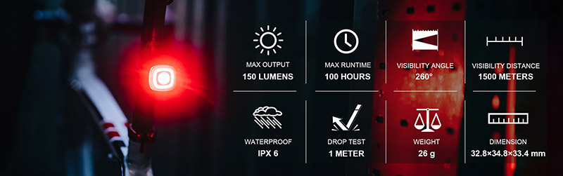 - LED o výkonu až 150 lumen (při brždění), viditelnost až 1500 metrů