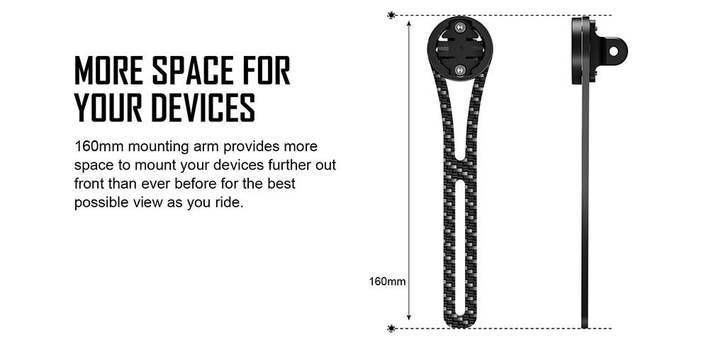 Materiál karbon o celkové hmotnosti pouze 23.5g (hmotnost včetně garmin držáku, adaptéru a šroubů). Pomocí podložek lze nastavit horizontální úhel držáku.