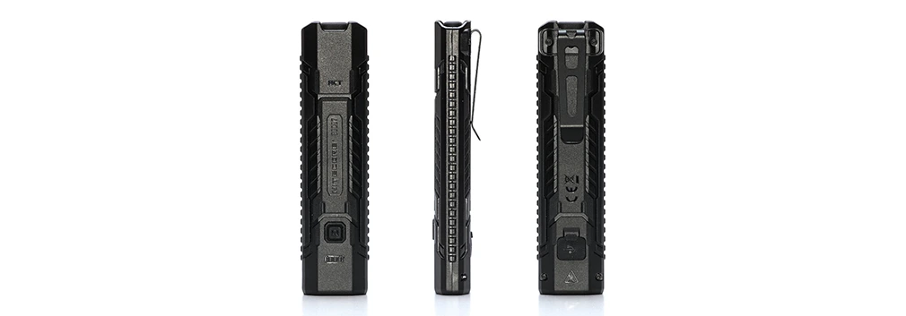 Tělo je vyrobeno z prémiového polykarbonátu pro maximální odolnost při minimální hmotnosti. Konstrukce je plochá a kompaktní, svítilna váží přibližně 70 g a je uzpůsobena pro každodenní nošení v kapse. Ovládání probíhá pomocí dvojice tlačítek, která umožňují rychlé přepínání režimů i změnu teploty světla. Elektronika zahrnuje inteligentní regulaci výkonu, tepelnou ochranu a ochranu proti podvybití baterie. Svítilna splňuje krytí IP67 a odolnost proti pádu z výšky 2 metrů.