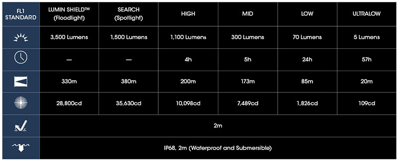 | Režimy jasu | LUMIN SHIELD™: 3500 lm (momentální) SEARCH: 1500 lm (momentální) Vysoký: 1100 lm (4 h) Střední: 300 lm (5 h) Nízký: 70 lm (24 h) Ultranízký: 5 lm (57 h) |
