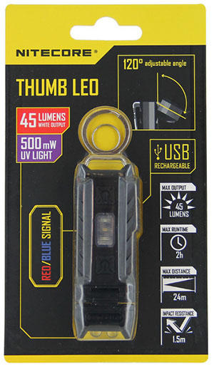Nitecore Thumb LEO je malá a micro USB dobíjecí klíčenka pro každodenní nošení – svítilna, která je vždy k dispozici. Je v ní osazena 1x vysoce svítivá bílá High LED s Max. výstupem 45lm, dosahem světla 24 metrů a dále 1x UV ultraviolet - ultrafialové světlo o výkonu 500mW. UV světlo má své uplatnění hlavně v bankovnictví, policejních složkách, metalurgii, šperkovnictví, starožitnictví atp.