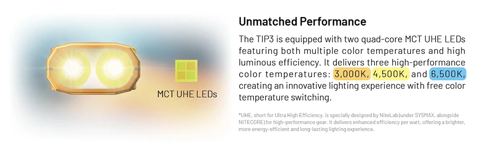Nitecore TIP3 využívá dvě quad-core MCT UHE LED diody, které umožňují plynulý přechod mezi třemi různými teplotami světla - teplá bílá (3000 K) pro pohodlné čtení, neutrální (4500 K) pro každodenní úkoly a studená bílá (6500 K) pro maximální viditelnost ve venkovním prostředí. Přepínání režimů je jednoduché a přizpůsobené rychlému použití, takže můžete světlo okamžitě nastavit přesně podle toho, co právě potřebujete - od jemného světla až po silné osvětlení při orientaci ve tmě.