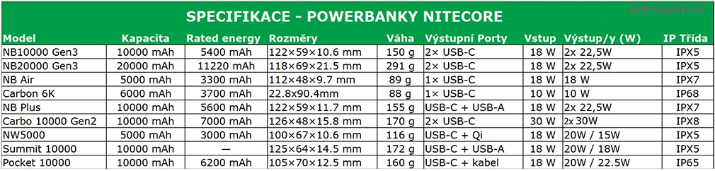 Pro usnadnění výběru powerbanky značky Nitecore jsme pro Vás připravili srovnávací tabulku specifikací: