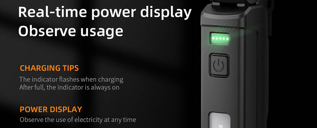 Pomocí inteligentních indikátorů můžete sledovat úroveň nabití vaší svítilny. Zelená barva indikátoru vám dá vědět, kdy je baterie vybitá a plně nabitá. Jeho stav tak můžete kdykoli zkontrolovat.