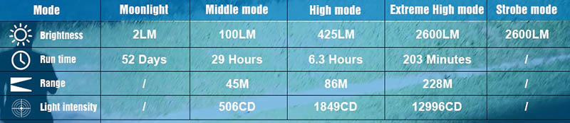 * Všechny parametry svítilny (světelný tok, doba provozu na baterie, vodotěsnost, dosvit a nárazuvzdornost) jsou změřeny za laboratorních podmínek v souladu s normou ANSI/NEMA FL 1-2009. Zejména ve vysokých režimech (může nastat také u nižších) dochází v průběhu svícení ke snižování výkonu například kvůli zamezení přehřátí nebo úspory baterie. Z výše uvedeného je tak zřejmé, že údaj výdrže u Turbo nebo dalších režimů neznamená, že takto dlouho svítilna svítí uvedeným výkonem. Počítá se čas výdrže jako doba, do které světelný výkon klesne na 10% počáteční hodnoty změřené 30 vteřin po zapnutí.